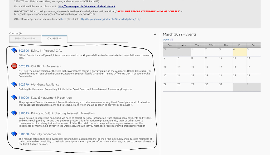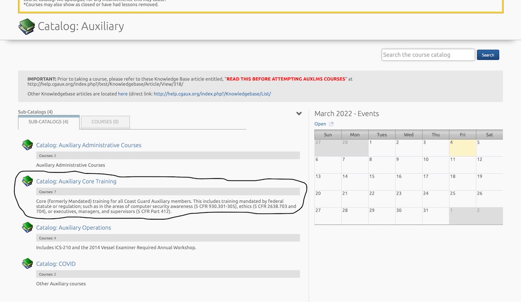 Just like the active and reserve members of the Coast Guard, Auxiliary Volunteers are also required to complete Core Training. Core Training is made up of six online and open-book tests. They include Workforce Resilience Training, Security Fundamentals, Protecting Personal Information, Sexual Harassment Prevention, Civil Rights Awareness and Ethics/Personal Gifts. Your mentor can help you navigate our various online training classrooms and will help take the mystique out of the “online test environment”. Use the link to complete your Core Training: https://auxlearning.uscg.mil/