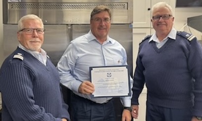 FC George Heesh awards Brad Haldeman a Certificate of Appreciation for his participation in the 2024 National Safe Boating Week.